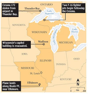 The North American Aerospace Defense Command ordered two F-16 fighter jets to intercept the stolen plane. They met the Cessna near the Michigan-Wisconsin border and shadowed the plane...”